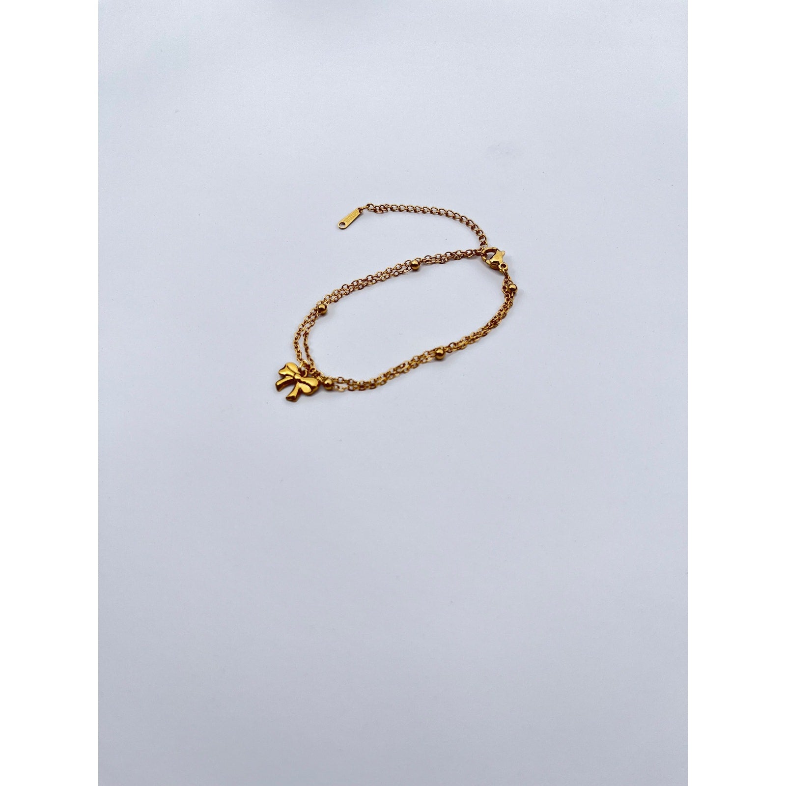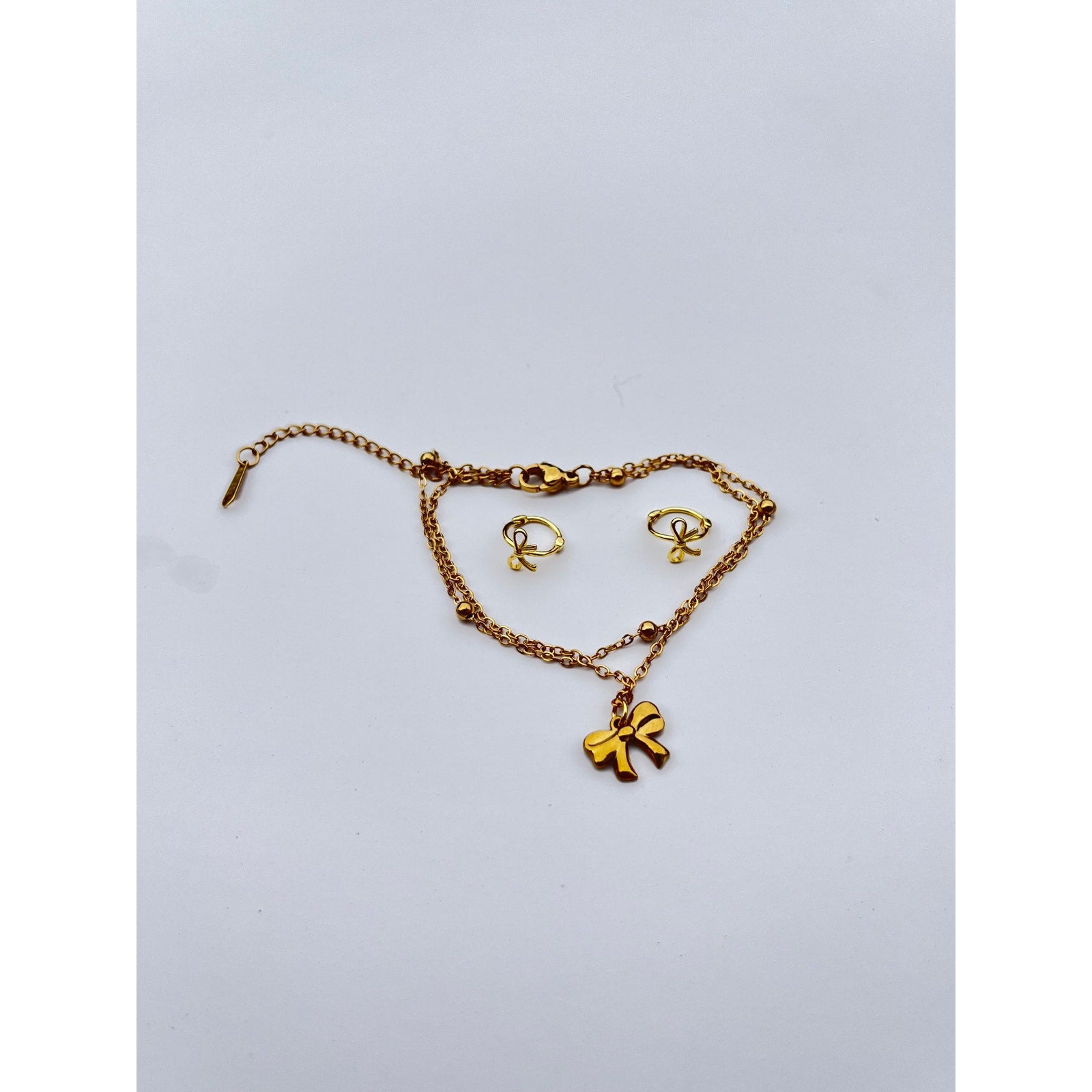 Elevate your style with this beautiful jewelry set featuring a pair of gold bow earrings and a matching bracelet. These pieces offer a touch of elegance without being ostentatious.